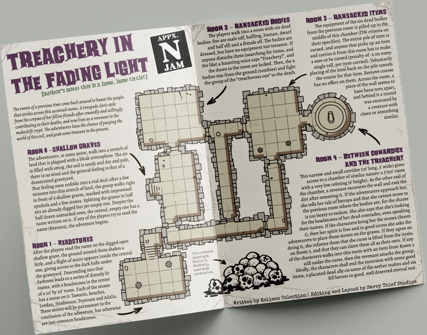 This is a 5 room dungeon with a horror/dread vibe. It is straightforward and easy to add or to adapt to any adventure with some room for horror/dread. Statistics are not provided, and te DM has to determine those and the contents of a treasure for the completion of this small dungeon incursion. The tittle of the module was pre-defined, and there was nothing that the author could do about it.